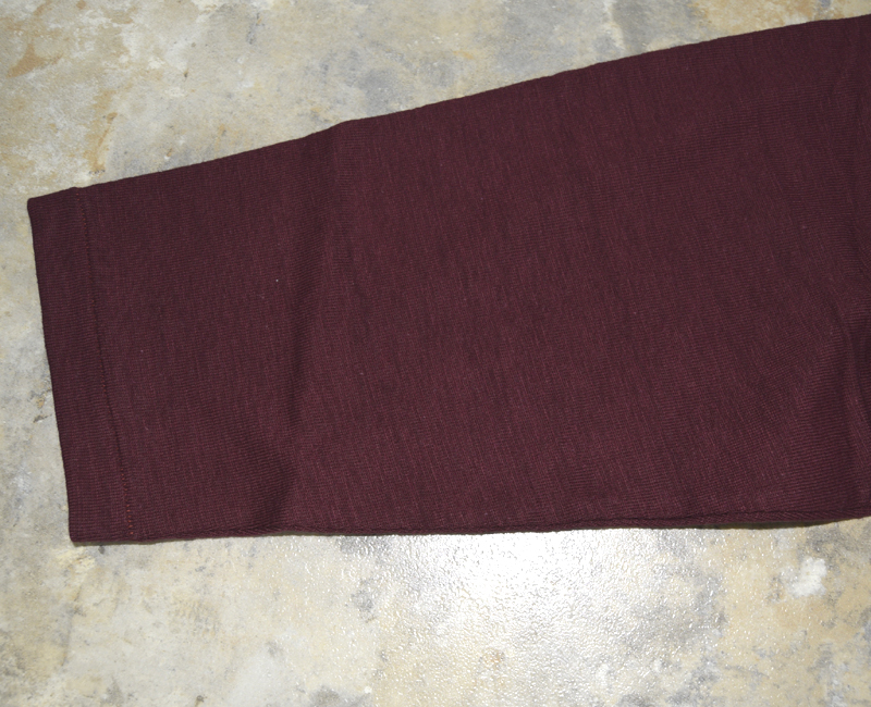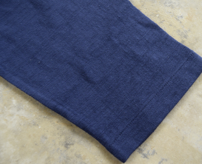 12番のムラ糸で独特の陰影が出るように編まれたこの生地はシャドウボーダーと呼ばれており、無地でありながらうっすらと横段のようなムラが浮かびます。