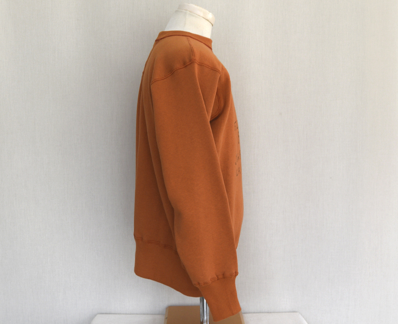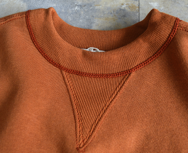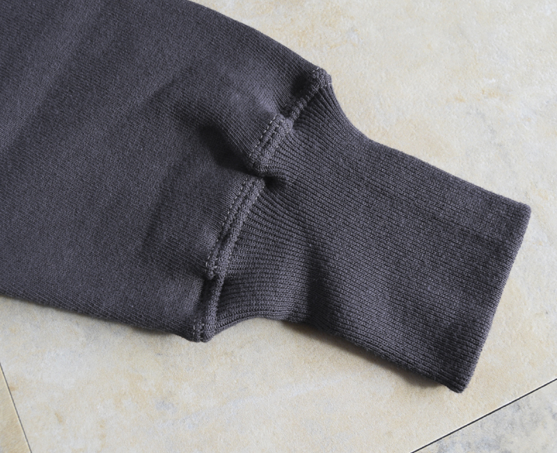 20年以上仕様を変更していない定番の吊り編みスウェットです。二本ステッチの間から粗めのロック糸が見える仕様はヴィンテージでしか見られないディテールですが、ミシンを改良することで実現させました。かつてコットンフリースラインドと呼ばれた裏起毛も、筒状のまま起毛をかけて再現しています。