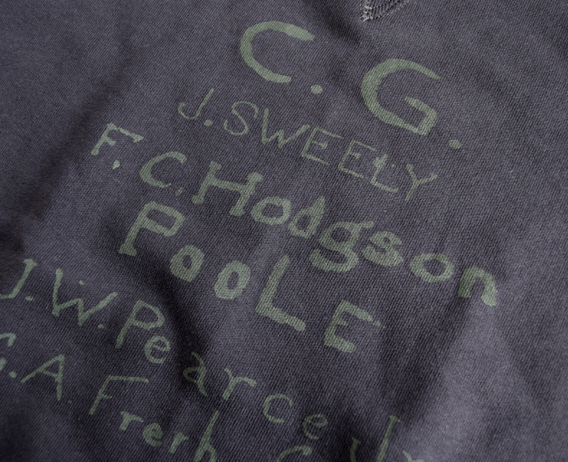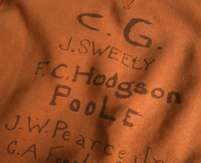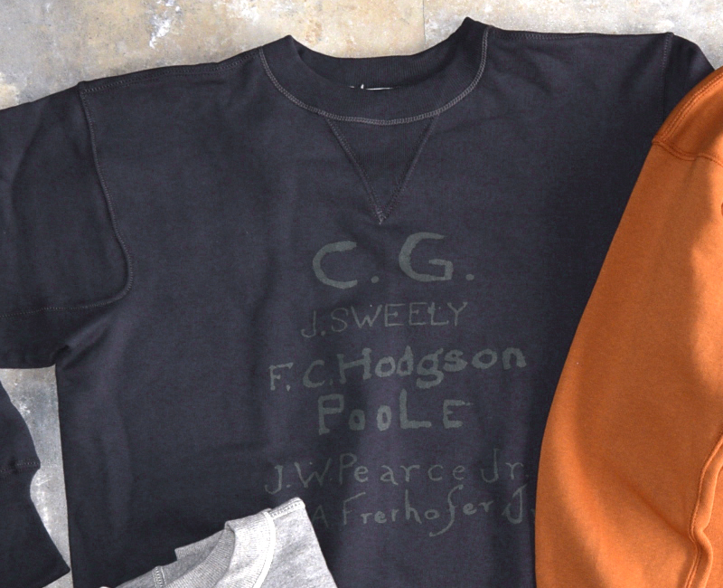 カットソーがウールからコットンに変わった1930年代からある挟み込み仕様の腰リブ。首まわりには伸縮に富むV字のフライスを前後に配した四本針仕様。肩口から垂直に落ちる袖口のセットインスリーブはややソリッドな印象を受けるシンプルなデザインですが、腰帯のバインダー仕様は着込むほどにアタリが生まれます。