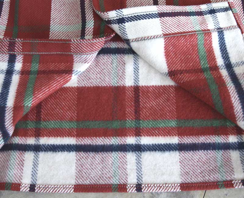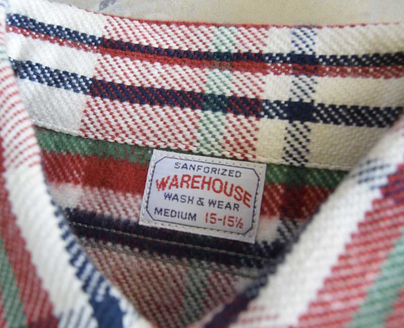 ウエアハウスのネルシャツは、生地に日本では限られた地域にしか残っていない力織機を使用して生地を作っています。フランネルの生地を作るために力織機を使う理由は単なる「耳付きのネル生地」を作りたいという理由からではありません、あくまでもセルビッチは副産物なのです。その目的は、力織機を使用することでムラ糸の持つ風合いを損なうことなく、生地に仕上げることができるからです。デニムと同じで、ヴィンテージネルシャツの生地を織っていた糸は不均一なムラ糸であった時代です。その糸を革新織機で強いテンションをかけて織ると違う生地になってしまう。せっかくの糸本来の性質が損なわれてしまうのです。旧式の力織機で織る事で、糸本来が持つ凹凸を損なうことなく生地を織ることが出来ます。ネルシャツを織る力織機はデニムと同じ綾織りの織機です。ネルシャツは柄を構成する必要があるため、多色の糸を織れる仕組みになっています。タテ糸は柄に合わせて複雑に上下移動し、その間を違う色のヨコ糸を持ったシャトルが次々に入れ替わり往復に移動します。こうして力織機らしい適度なテンションで織られたフランネルは、それぞれの糸本来が持っているムラを損なうことなく生地となるのです。生地になったネル生地は、当時の製法に倣って生地の裏に起毛加工を施しています。起毛をかけることで柄に柔らかい表情が生まれます。さらに起毛をかけることで生地に膨らみを生み、力織機ならではの肌触りをさらに柔らかなものに昇華させることができます。このように、力織機で織られたネルは、糸そのものから再現することでこそ生まれる風合いを持っています。それを見分ける最も簡潔な方法がセルビッチ(耳)の有無であり、1960年代頃までのヴィンテージネルシャツと同じように、ウエアハウスでもマチ部分にセルビッチを使用しているのです。