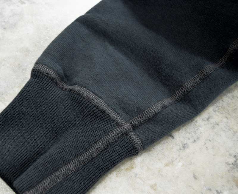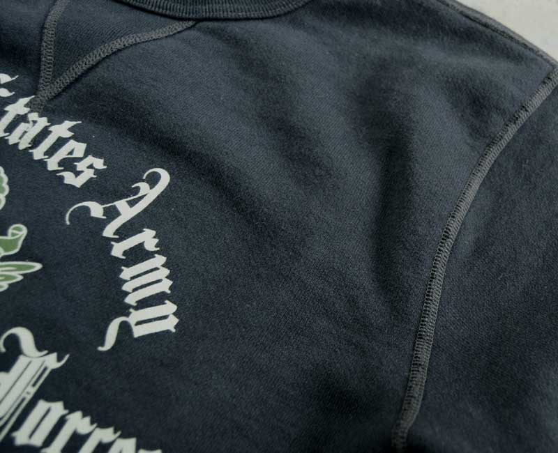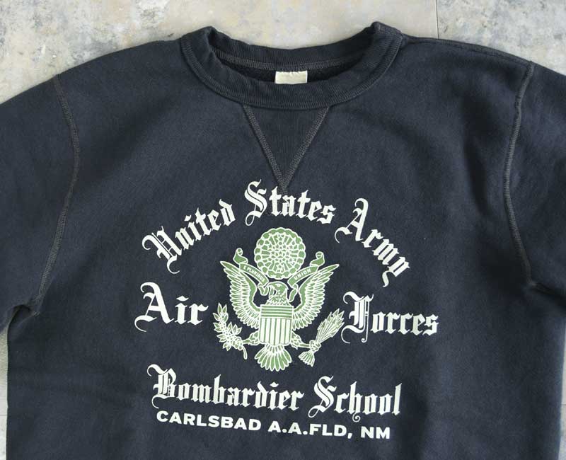ウールニットの素材からループ状の裏起毛を持つコットン素材に生まれ変わり、“汗を吸うシャツ”として米国民のデイリーウェアとして進化を遂げたスウェットシャツ。ハードなトレーニングを日常とする軍や士官学校もいち早く目を付け、全米に点在する基地売店でも扱われるようになった。素材は当時と同じように不均一なテンションで編み込まれる筒状の吊り編み機を使用しているため、特有の柔軟性を持つ素材である。縫合は肌着などに適した4本針のフラットシーマによるもので、V字型のガゼットは身頃の上にリブ素材を乗せて縫い付けた、通称“叩き付けV”の仕様。
