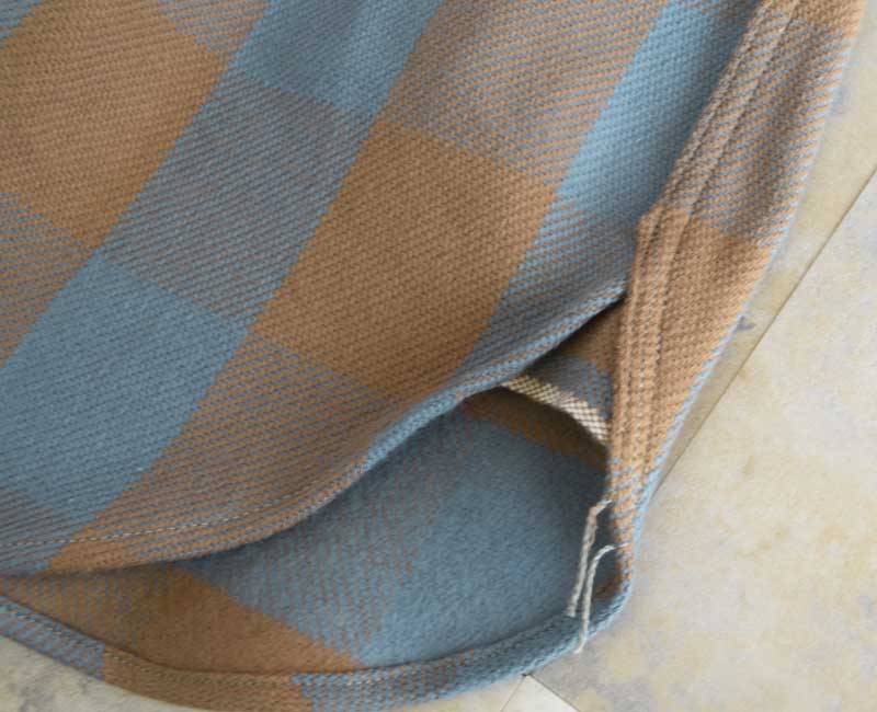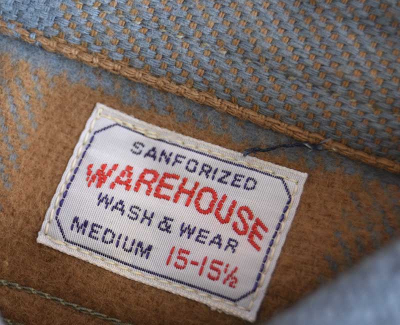 ウエアハウスのネルシャツは、生地に日本では限られた地域にしか残っていない力織機を使用して生地を作っています。フランネルの生地を作るために力織機を使う理由は単なる「耳付きのネル生地」を作りたいという理由からではありません、あくまでもセルビッチは副産物なのです。その目的は、力織機を使用することでムラ糸の持つ風合いを損なうことなく、生地に仕上げることができるからです。デニムと同じで、ヴィンテージネルシャツの生地を織っていた糸は不均一なムラ糸であった時代です。その糸を革新織機で強いテンションをかけて織ると違う生地になってしまう。せっかくの糸本来の性質が損なわれてしまうのです。旧式の力織機で織る事で、糸本来が持つ凹凸を損なうことなく生地を織ることが出来ます。ネルシャツを織る力織機はデニムと同じ綾織りの織機です。ネルシャツは柄を構成する必要があるため、多色の糸を織れる仕組みになっています。タテ糸は柄に合わせて複雑に上下移動し、その間を違う色のヨコ糸を持ったシャトルが次々に入れ替わり往復に移動します。こうして力織機らしい適度なテンションで織られたフランネルは、それぞれの糸本来が持っているムラを損なうことなく生地となるのです。生地になったネル生地は、当時の製法に倣って生地の裏に起毛加工を施しています。起毛をかけることで柄に柔らかい表情が生まれます。さらに起毛をかけることで生地に膨らみを生み、力織機ならではの肌触りをさらに柔らかなものに昇華させることができます。このように、力織機で織られたネルは、糸そのものから再現することでこそ生まれる風合いを持っています。それを見分ける最も簡潔な方法がセルビッチ(耳)の有無であり、1960年代頃までのヴィンテージネルシャツと同じように、ウエアハウスでもマチ部分にセルビッチを使用しているのです。