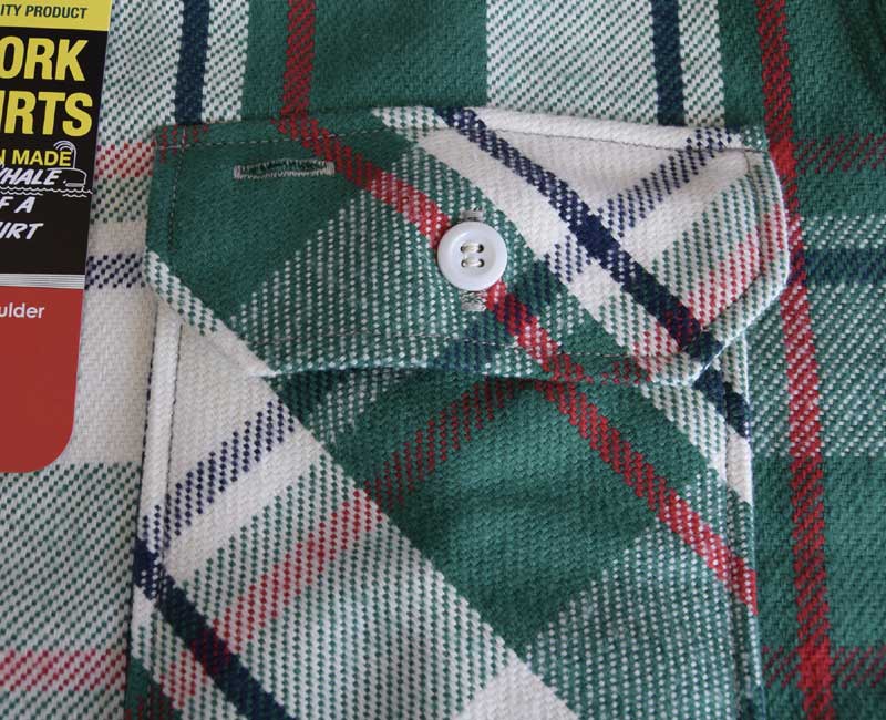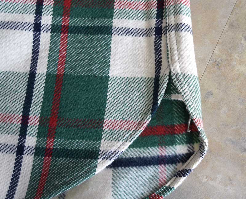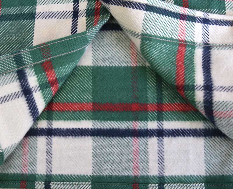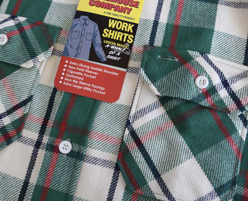 ウエアハウスのネルシャツは、生地に日本では限られた地域にしか残っていない力織機を使用して生地を作っています。フランネルの生地を作るために力織機を使う理由は単なる「耳付きのネル生地」を作りたいという理由からではありません、あくまでもセルビッチは副産物なのです。その目的は、力織機を使用することでムラ糸の持つ風合いを損なうことなく、生地に仕上げることができるからです。デニムと同じで、ヴィンテージネルシャツの生地を織っていた糸は不均一なムラ糸であった時代です。その糸を革新織機で強いテンションをかけて織ると違う生地になってしまう。せっかくの糸本来の性質が損なわれてしまうのです。旧式の力織機で織る事で、糸本来が持つ凹凸を損なうことなく生地を織ることが出来ます。ネルシャツを織る力織機はデニムと同じ綾織りの織機です。ネルシャツは柄を構成する必要があるため、多色の糸を織れる仕組みになっています。タテ糸は柄に合わせて複雑に上下移動し、その間を違う色のヨコ糸を持ったシャトルが次々に入れ替わり往復に移動します。こうして力織機らしい適度なテンションで織られたフランネルは、それぞれの糸本来が持っているムラを損なうことなく生地となるのです。生地になったネル生地は、当時の製法に倣って生地の裏に起毛加工を施しています。起毛をかけることで柄に柔らかい表情が生まれます。さらに起毛をかけることで生地に膨らみを生み、力織機ならではの肌触りをさらに柔らかなものに昇華させることができます。このように、力織機で織られたネルは、糸そのものから再現することでこそ生まれる風合いを持っています。それを見分ける最も簡潔な方法がセルビッチ(耳)の有無であり、1960年代頃までのヴィンテージネルシャツと同じように、ウエアハウスでもマチ部分にセルビッチを使用しているのです。