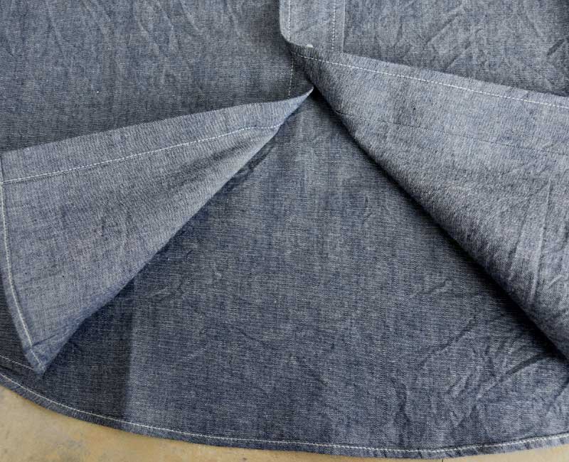 1950年代のシャンブレーシャツがベース。ワークウエアらしい3本針巻き縫い仕様のタフな作り。経糸にインディゴ糸、緯糸を白糸で織り上げたブルーシャンブレー生地を使用している。同型でショートスリーブモデルも展開。