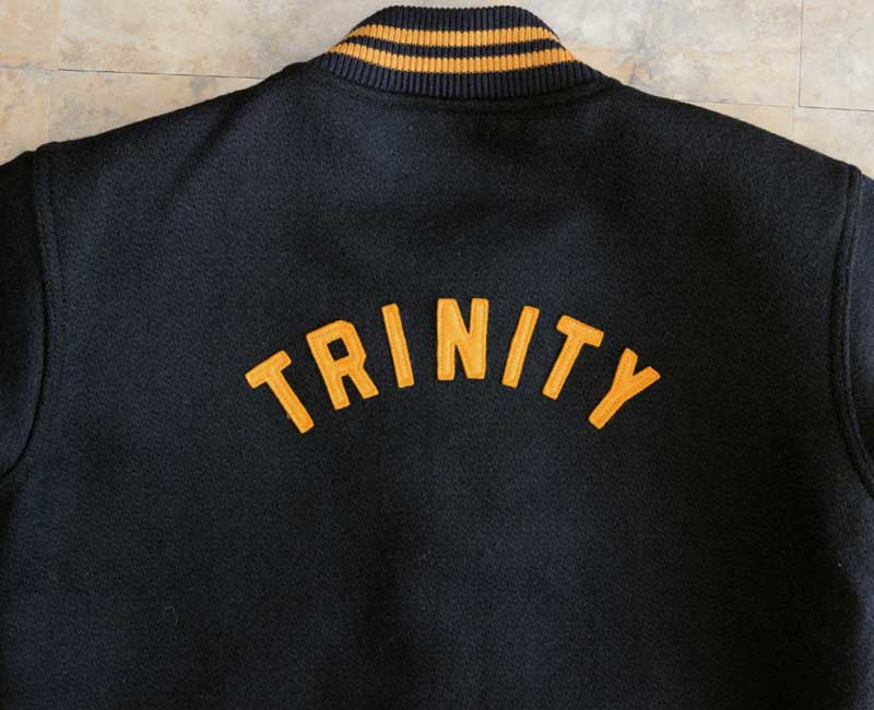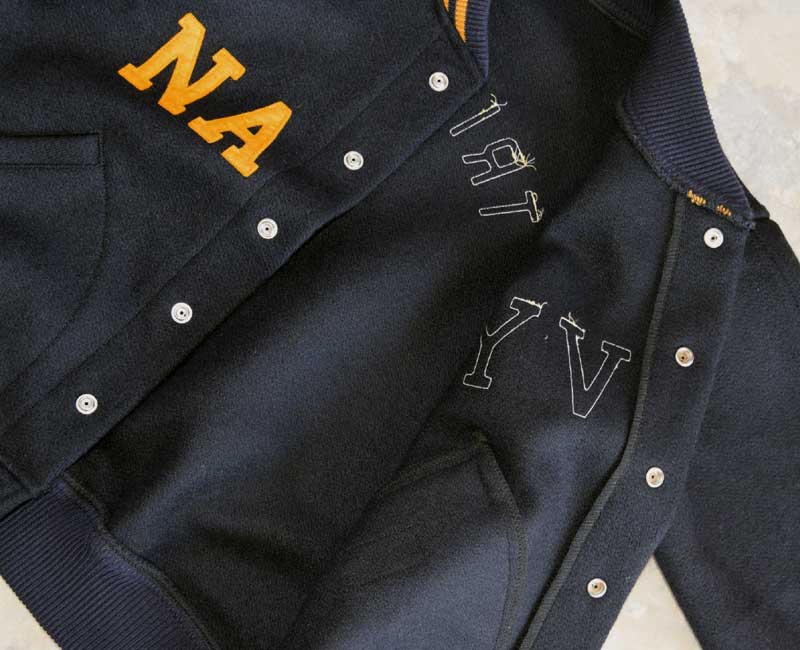 オールメルトンのスナップボタン仕様、ネイビーとフェルトレタリングされたヴァ―シティジャケットです。