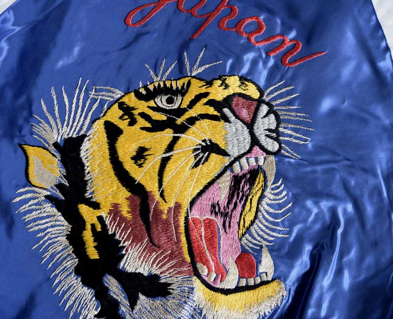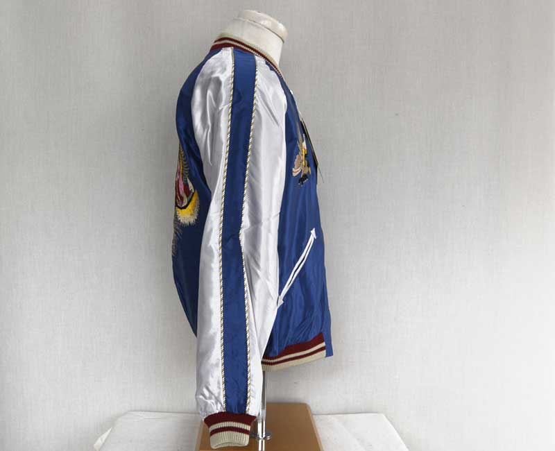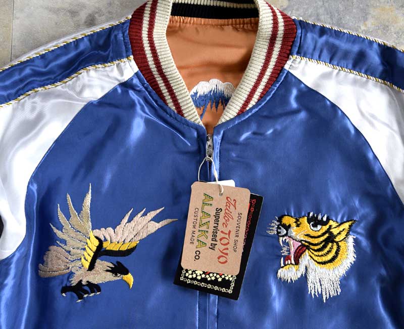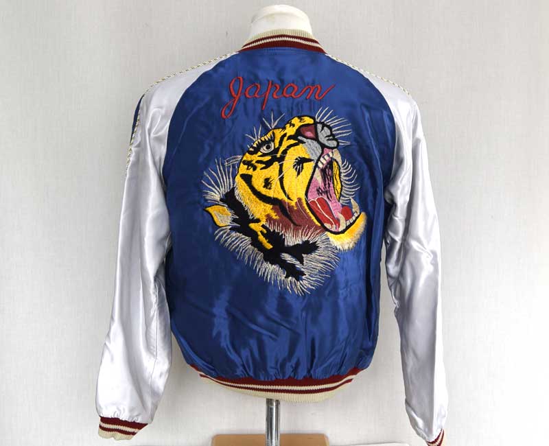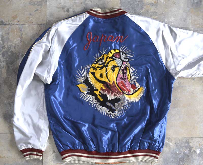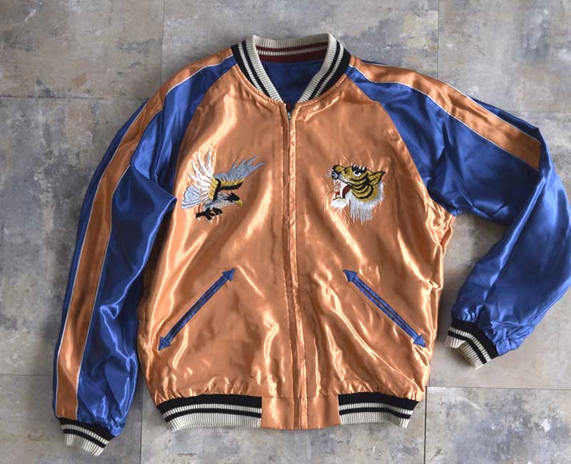 スーベニアジャケットのなかで最もスタンダードな両面にアセテート生地を使ったリバーシブルタイプ。戦後当時のスカジャンには、シルクに似た高級感を持つ物資統制外品目のアセテートが使われていた。中綿がないため季節を問わず着用でき、独特なドレープ感も魅力といえる。