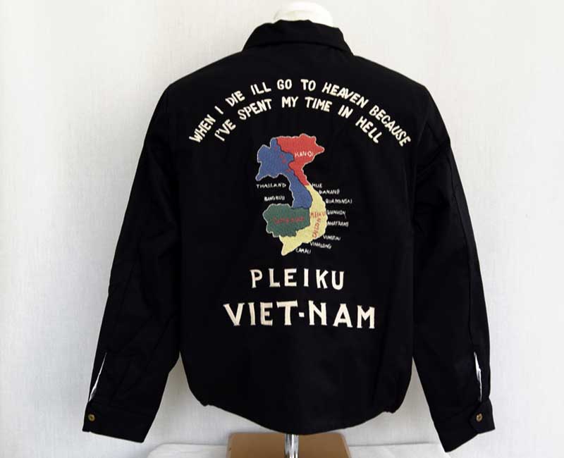 戦後の日本で誕生したスカジャン同様、1960年代から1970年代のベトナム戦争時に生まれたスーベニアジャケットが、通称ベトジャン。コットンツイル、もしくはカモフラージュ柄のポンチョライナーの2種類の生地が主に使われ、マットな太めの色糸で絵柄が刺繍されている。