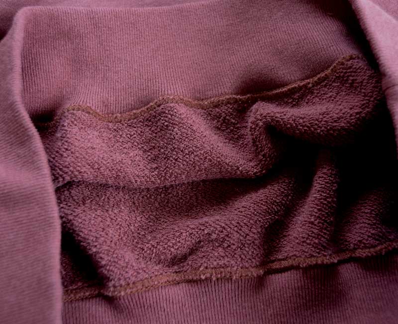 生地には30/30/10番手の糸を使用し、丸胴の吊り編み機でゆっくりと時間をかけて編み立てられています。裏毛は起毛させずループ状のまま仕上げられているため、吸湿性にも優れ、着込むほどに柔らかく肌になじむ風合いが魅力です。
