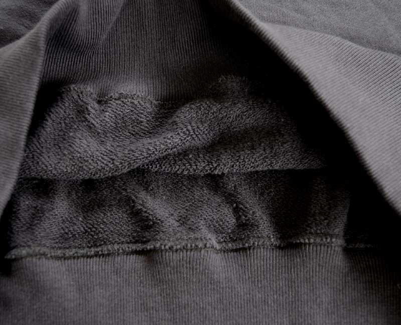 生地には30/30/10番手の糸を使用し、丸胴の吊り編み機でゆっくりと時間をかけて編み立てられています。裏毛は起毛させずループ状のまま仕上げられているため、吸湿性にも優れ、着込むほどに柔らかく肌になじむ風合いが魅力です。