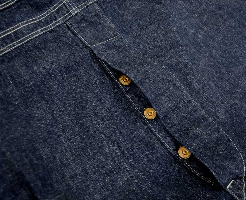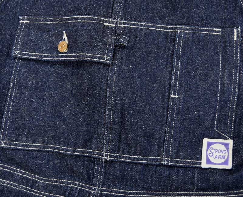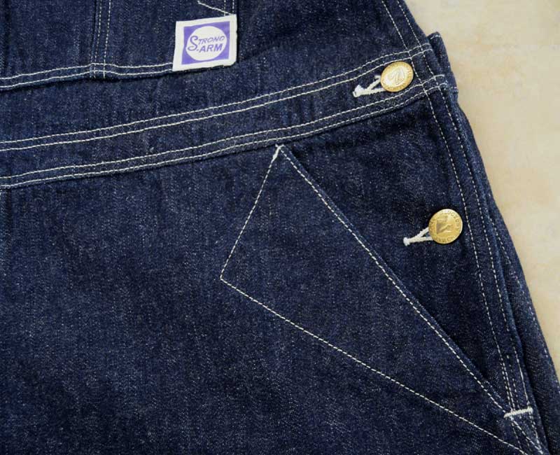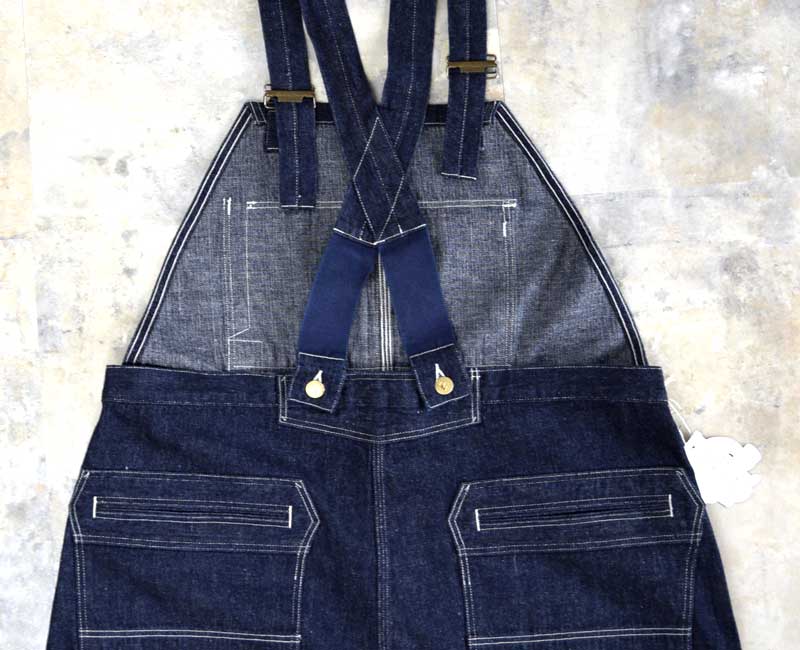 また、オーバーパンツのリアポケットには、ジャケットでは何度か見たことがあるが、パンツやオーバーオールでは見たことのない補強が施されています。こうして出来上がったのがシャドーストライプのインディゴデニムを使ったストロングアーム・レインフォースド・オーバーオールなのです。by John Gluckow