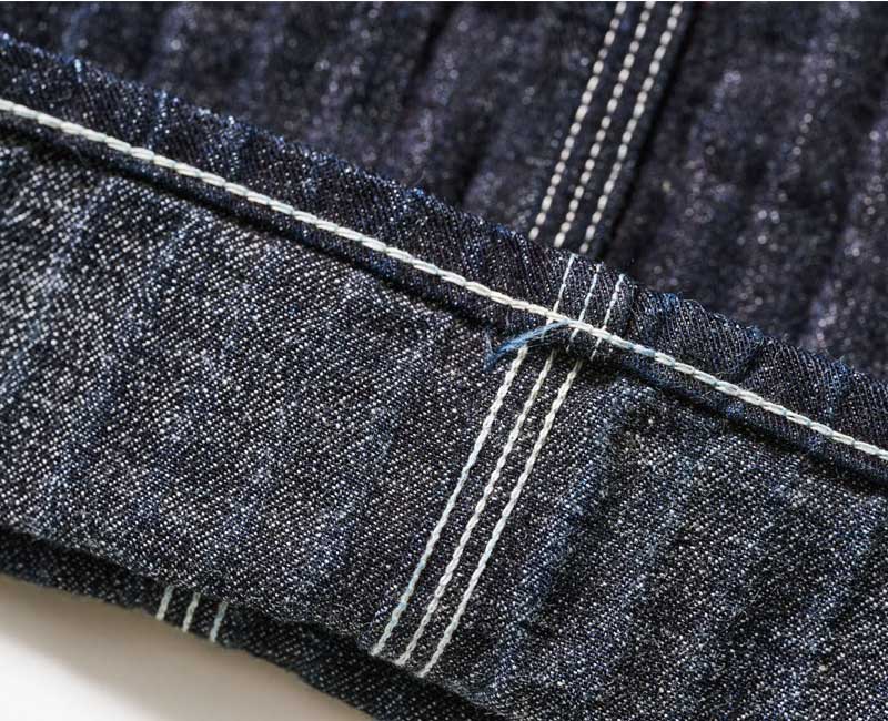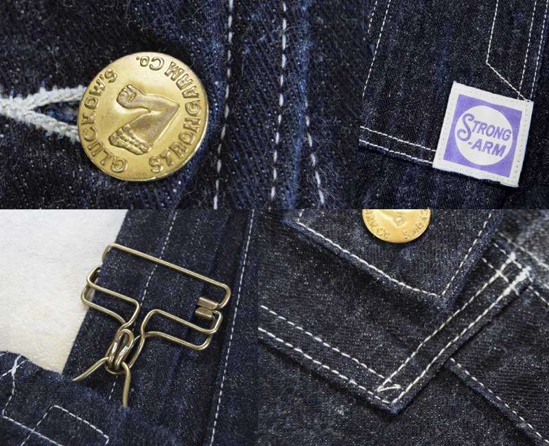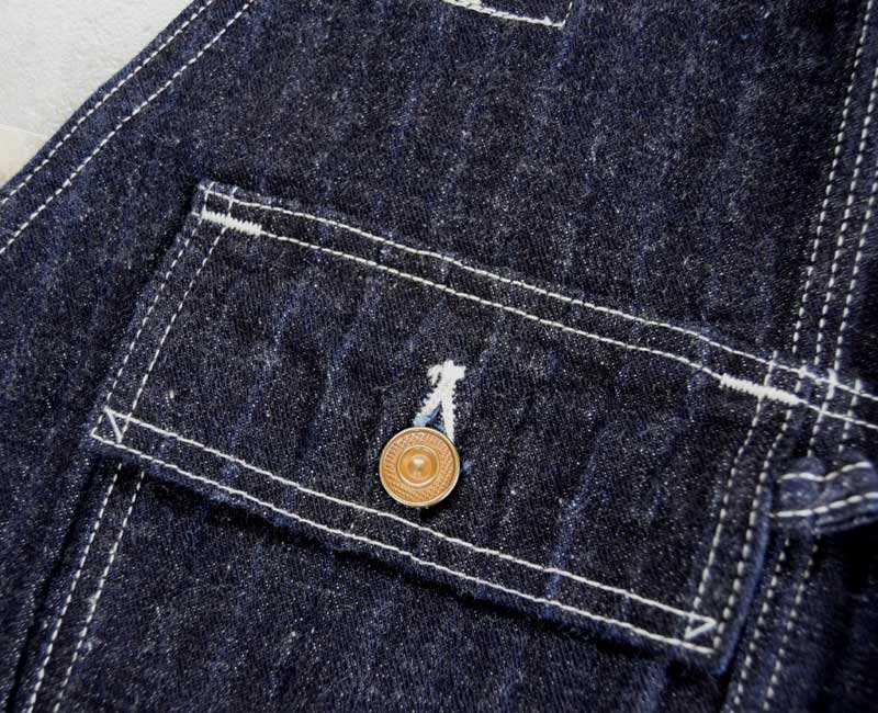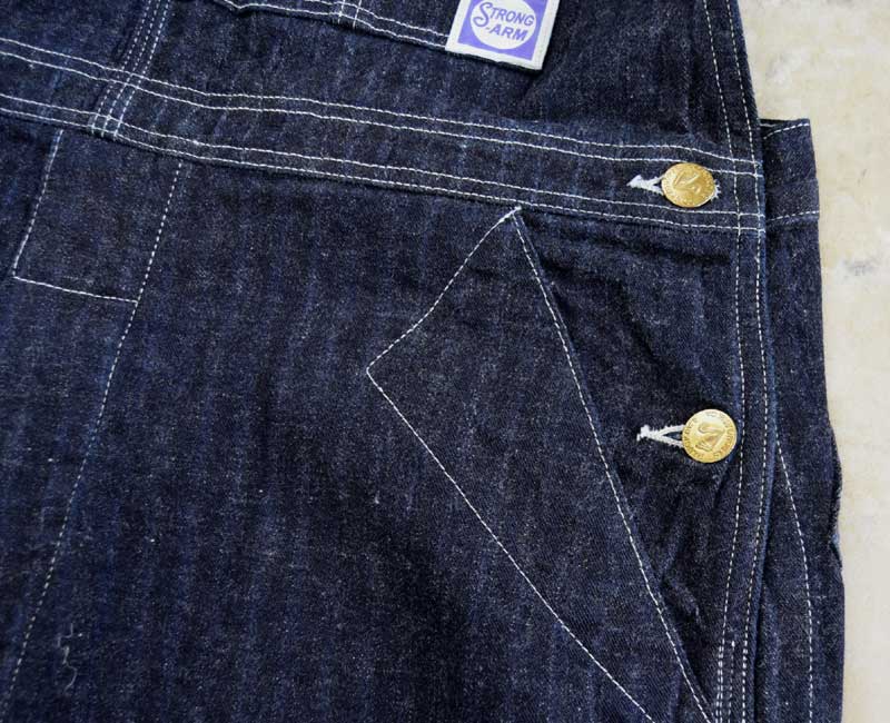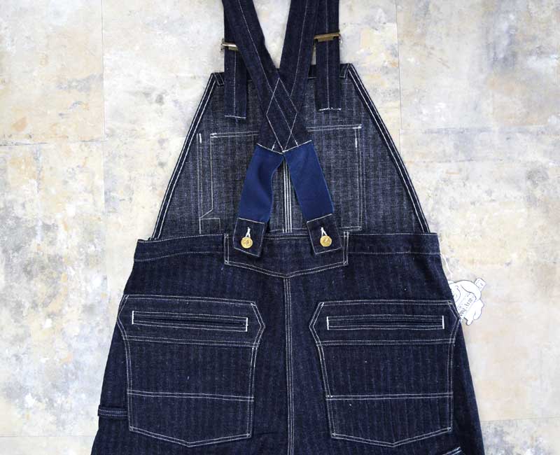 また、オーバーパンツのリアポケットには、ジャケットでは何度か見たことがあるが、パンツやオーバーオールでは見たことのない補強が施されています。こうして出来上がったのがシャドーストライプのインディゴデニムを使ったストロングアーム・レインフォースド・オーバーオールなのです。by John Gluckow