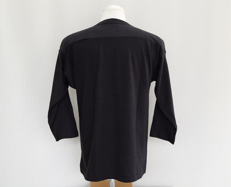 12番のムラ糸で独特の陰影が出るように編まれたこの生地はシャドウボーダーと呼ばれており、無地でありながらうっすらと横段のようなムラが浮かびます。